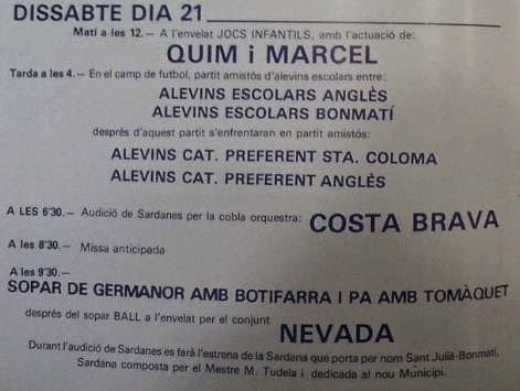 Per demà diumenge està previst el tercer concurs de colles sardanistes de petits dansaires. En el transcurs de la diada es farà un homenatge als regidors Rogeli, Vidal i Piserra per la seva tasca envers el nou municipi de Sant Julià-Bonmatí.